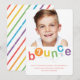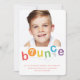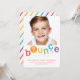 Esta invitación de cumpleaños con foto de bounce presenta letras saltarinas en una paleta de colores de arcoíris de rojo, naranja, amarillo, verde, azul y púrpura con edad editable en la O. Una toma súper divertida y neutral en cuanto al género en una fiesta de trampolín, gimnasia o bounce house. Esta invitación está inspirada en todos los niños que les gusta saltar, rebotar y volar.
