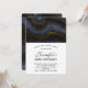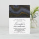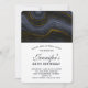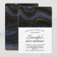 Una invitación de cumpleaños con una hermosa imagen de una piedra de ágata abstracta oscura. Los colores se arremolinan en olas. Los colores principales son negro, gris azulado con una cinta de oro falso que atraviesa el diseño. Moderno y trendy.