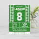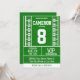 Esta invitación de fiesta tiene un tema de fútbol americano, con un campo de fútbol verde colocado como fondo. Las líneas de yarda del campo están colocadas a los lados, con la edad del niño que cumple años impresa en el centro. La edad está impresa en una fuente deportiva grande que se asemeja a un número de jersey.