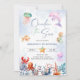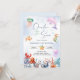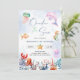 Divertida y colorida invitación de cumpleaños número uno "ONEder bajo el mar" con animales marinos de acuarela, burbujas y fondo de salpicadura de acuarela azul claro.