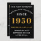 Para aquellos que nacen en 1950 y celebran su fiesta de cumpleaños tenemos la tarjeta de invitación ideal para su cumpleaños. El fondo negro, blanco y dorado, es sencillo y elegante. Personalizar fácilmente el texto en la parte delantera y trasera de esta tarjeta de invitación de cumpleaños utilizando la plantilla proporcionada. Parte de la gama de normas de configuración de tarjetas, suministros para fiestas y regalos.
