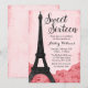 Invitaciones temáticas del dulce 16 de París. Ofreciendo un ilustracion negro de la torre Eiffel y rosas rosados en un vintage pique el fondo. Algunos gráficos por www.jwillustrations.com
