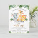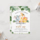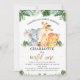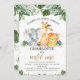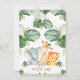 Invitación de primer cumpleaños con tema safari para una bebé con tres adorables animales safari de acuarela y follaje de jungla o vegetación. La palabra uno con brillo dorado falso es extraíble.