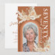 Invitaciones de cumpleaños bohemias rústicas para los 70 años con fondo de naranja quemada con un arco de arcoíris, una foto de la cumpleañera, hojas de palma secas del desierto acuarela, hierba de pampas, flores y una plantilla de texto de celebración de setenta elegante en el reverso que es fácil de personalizar.