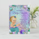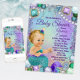 Invitación a baby shower de sirena con adorable bebé sirena rubia con cola azul turquesa en un hermoso fondo de joyas bajo el mar. Esta linda invitación para baby shower de sirena se personaliza fácilmente para su evento con solo agregar los detalles del evento.