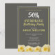 Invitación moderna de cumpleaños sorpresa número 50 para ella. Invitación de cumpleaños con hermosas flores de rosa amarilla. El fondo es gris. El texto es de color blanco y amarillo y es fácilmente personalizable - personalízalo con tu nombre, edad, fecha, ubicación y RSVP. Perfecto para una mujer que está celebrando su cumpleaños número cincuenta. Invitación para una fiesta de cumpleaños sorpresa de 50 años.