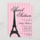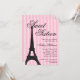 Una invitación temática de moda del dulce 16 de París. Ofreciendo un ilustracion de la torre Eiffel en una raya rosada modele el fondo. Tamaño: 4,5" x 6,25" gráficos por los ilustraciones de JW en MyGrafico