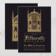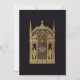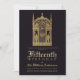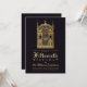 Esta invitación vintage en negro y dorado para una fiesta de cumpleaños con tema medieval tiene en la parte superior una puerta de castillo medieval entre dos torres góticas, custodiada por dos caballeros con armaduras, con alabardas. Sobre ellos hay otros dos caballeros con armaduras, montados a caballo, llevando banderas, y en el centro, sobre la puerta, hay un león heráldico. El texto está escrito en letras doradas debajo de la ilustración. El nombre y la edad están escritos con fuentes góticas de estilo medieval. El fondo es negro.