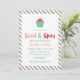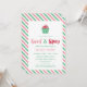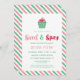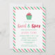 Invitación azucaradamente linda para una despedida de soltera temática dulce y picante con rayas diagonales rosadas y verdes, fuentes lindas, y un cupcake adornado con un chile y glaseado rosa.