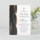 The left-hand edge of this elegant modern first communion invitation features a black watercolor agate border trimmed with faux gold glitter. A faux gold foil cross appears above the customizable text, which combines handwriting, copperplate and italic fonts in charcoal gray on a white background. Easily replace the sample image on the reverse side with your child's photo.