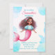 This aquatic invitation features an undersea theme in pink and aqua/light blue. At its heart is a brown-skinned mermaid with a scaly pink tail and aqua top, perfect for birthday black girls and more! Also featured are other sea elements.