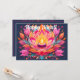 This Diwali card glistens with spiritual warmth and festive charm. A stunning lotus takes center stage, its layered petals painted in rich pinks, tangerine, and deep violet, each one radiating outward like ripples from a sacred flame. Nestled at its heart is a glowing diya, flickering gently with golden light. The backdrop is a twilight canvas of midnight blue, speckled with delicate dots and flourishes, adding a celestial touch.