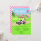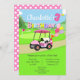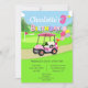 ¡Celebra el tercer cumpleaños de una niña especial con esta encantadora invitación temática al golf! Con un adorable carrito de golf de punto de polka rosa estacionado al lado de un putting green, este dulce diseño está lleno de detalles juguetones, un pastel de cumpleaños festivo y un montón de globos de helio brillantes, incluido un gran globo número 1. Perfecto para una familia amante del golf o para un tema único de tercer cumpleaños, esta invitación marca la pauta para un día divertido dentro y fuera del verde.