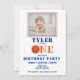 Invitación de primer cumpleaños con una foto de Cute Basketball. Cute boy's en la fiesta de cumpleaños de baloncesto para el primer cumpleaños. El diseño tiene un gran baloncesto y un patrón de rayas azules y blancas en la parte trasera. Personaliza esta invitación de cumpleaños con el nombre de un niño y una foto y personaliza todos los datos de la invitación.