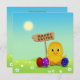 Ilustración linda de Pascua con un pollito que sostiene un cartel de madera con un saludo de Feliz Pascua, sentado en un campo de flores junto a huevos de Pascua de colores.