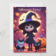 Esta invitación presenta a una pequeña bruja con un disfraz negro con gatos y calabazas en la noche de Halloween.