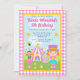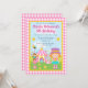 Cute Circus Tent y Red Haired chica diseño de entrenador con bolas de malabares de monos, elefante, flores y fondo de pradera con fondo de gingham rosa