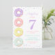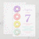 Cute and sweet kids birthday party invitations featuring watercolor donuts and colorful sprinkle with number '7' in a large bold serif font. All text can be personalized.
