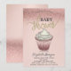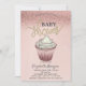 La invitación de baby shower linda presenta bokeh brillante rosa dorado con un pastelito de baby shower. Estas invitaciones de baby shower se personalizan fácilmente para su evento simplemente agregando sus detalles.