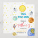 Adorable invitación de segundo cumpleaños con temática de espacio exterior con un bonito sol, planetas, cohete, astronauta. Perfecto para celebrar a tu pequeño de 2º cumpleaños con colorido tema de fiesta cósmico.