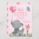 Invite all your family and guests with this cute and girly birthday party invitation. Watercolor elephant holding a heart shaped ballon, while a butterfly and flower complete the scene.