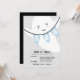 ¡Las invitaciones a la fiesta infantil Halloween son perfectas para los niños de halloween, trucos de barrio o para tratar eventos, fiestas de disfraces y celebraciones de Halloween espumosas! El diseño de la cúpula incluye un sonriente ilustracion fantasma de acuarela que sostiene banderas con la palabra "BOO". Paleta gris azul blanco y negro, todos los colores se pueden cambiar. Personalice con los detalles de su fiesta bajo letras negras.