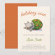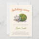 Adorable hatching soon baby shower invitation with an illustration of a baby dinosaur or baby dragon about to hatch. Great for gender neutral baby showers since the colors are neutral green, orange and grey. Illustrated and designed by Patricia Alvarez.