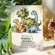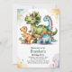 Este adorable diseño de la fiesta de cumpleaños de los dinosaurios para niños tiene cinco dinosaurios acuarelas realistas en el centro. Estos dinosaurios son verdes, azules, amarillos y naranjas. Están rodeadas por un borde acuático de color morado, verde y amarillo. Hay espacio para agregar el nombre de su hijo, información sobre el fiesta, información de RSVP y más. ¡Disfrútalo!