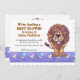 El Baby Shower Invite de Cabezas y Caras de León de Desfile Animal es para el lado divertido de usted con nuestro arte original de un león caprichoso y un lindo borde morado texturizado con un patrón de rebote y pacificador. En la parte delantera está el león del frente con toda la información de su fiesta. En la parte de atrás se ve al bonito rey de la jungla. Únete al Desfile de Animales y lanza un festín lleno de animales con nuestras divertidas cabezas y cruces con artículos de fiesta temáticos sobre leones. ¡Pasen bien en el rasguño!