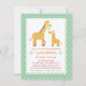 Un lindo ilustracion de una madre y un bebé jirafa de ternera con una jirafa mamita tomando un tallo de hojas para alimentar al pequeño. Celebra la llegada de la pequeña con esta adorable y neutra invitación a la ducha de bebé en una paleta de colores verde, amarillo y marrón.