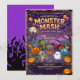 Get ready for a graveyard smash with this vibrant and playful Monster Mash Halloween birthday invitation! Perfect for a "spooktacular" celebration, the design features a cast of friendly, colorful monsters including a mummy, ghost, and Frankenstein's monster, all gathered around a birthday cake. Set against a whimsical purple night sky with pumpkins, bats, and a haunted house, this invitation is ideal for children's October birthdays or costume parties. All text is fully editable, allowing you to easily personalize the name, age, and party details for your little monster's special day.