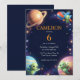 This custom birthday party invitation features a playful outers pace theme. Three cute green aliens are pictured near planets, glowing stars, and a little rocket ship. The colorful and charming illustration on this invite is perfect for a child's birthday.