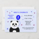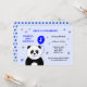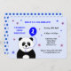 Esta encantadora invitación a la fiesta de cumpleaños 1 tiene un panda sonriente con un globo azul de primer cumpleaños. "¡Ayúdanos a celebrar!" Todo el texto es editable, simplemente escriba los detalles de su fiesta en los cuadros de personalización. El fondo de la carta es azul claro y algunas estrellas rojas, blancas y azules están dispersas. En la parte trasera, se observa un patrón de puntos polka azules con una sola estrella en el centro.