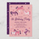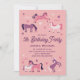 Caballos blancos, morados y rosados se crean en un patrón para hacer la invitación de cumpleaños ecuestre perfecta para un chica y amante de los caballos. El color de fondo es fácil de personalizar.