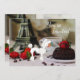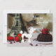 Esta invitación personalizada de cumpleaños para chicas con temas de París y Perro presenta un lindo, blanco, personalizado de cangrejo olfateando una pastelería de chocolate con una fresa. Al fondo, hay una estatua de la Torre Eiffel rodeada de fresas.