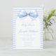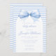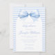 Celebra la llegada de tu pequeño con nuestra encantadora y elegante invitación a la ducha de bebé con tema Coquette. Con una pequeña proa azul en arco bohemio y un patrón a rayas en la parte trasera, esta invitación marca el tono perfecto para una dulce celebración de un adormidera.