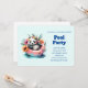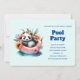 Invitación a una fiesta de pool-pool en verano con una adorable imagen veraniega. Un diseño acuático con un panda blanco y negro sentado en una junta de natación en el agua. Rodeado de flores silvestres de bonito. Un oso totalmente frío.