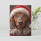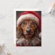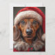 La imagen muestra un adorable dachshund vestido con atuendo festivo, con un gorra rojo de Santa Claus con un adorno blanco esponjoso. Los ojos grandes y expresivos del perro y su brillante nariz negra son los puntos centrales de la toma de video, creando una vibrante y encantadora sensación navideña. El dachshund también está vestido con un acogedor traje rojo y un lujoso collar de piel, lo que añade un ambiente festivo y acogedor a la escena.