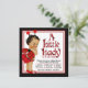 Invitación de fiesta de bebé mariquita con adorable bebé étnica vestida con un traje de mariquita rojo y negro en un bonito fondo rojo y negro con texto de mariquita. Puede personalizar fácilmente esta adorable invitación de fiesta de bebé mariquita roja y negra para su evento simplemente agregando sus detalles en el estilo de fuente y color que prefiera.