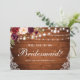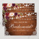 Tarjeta de Damas de Honor Floral Burgundy Marsala de Acuarela con Luces de Cuerda de Madera para Boda Rústica