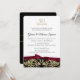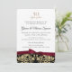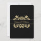 Invitación de damasco dorado y negro romántico con acento burdeos decorada en la parte superior e inferior con un majestuoso emblema dorado en la parte posterior. Texto de estilo clásico y formal y obra de arte dibujada a mano para un conjunto de invitaciones de 50 Aniversario único y hermoso.