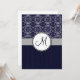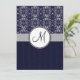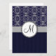 Invitación Damasco plateado en azul con franjas y monograma