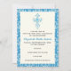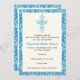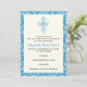 Damask First Holly Communion / Baptism / Invitación de confirmación, con un borde damasco azul y una elegante cruz azul sobre fondo de marfil. Una invitación religiosa moderna para el evento tradicional de la Primera Santa Comunión, apta para niños y chicas. Se puede usar para varias ocasiones como bautismo / cristianismo o confirmación.