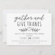Celebra Acción de Gracias con tus seres queridos con esta moderna y elegante invitación. En la invitación aparece la palabra "reunir y dar las gracias" sobre un fondo blanco. La manera perfecta de invitar a sus huéspedes a una noche memorable de comida, diversión y becas.