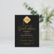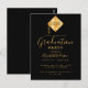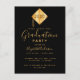 Una elegante y simple tarjeta de invitación para una fiesta de graduación para él y ella. Un fondo negro y una moderna tassel abstracto negro en oro falso con el año dentro. Plantilla para el nombre y los detalles del fiesta. El texto Graduación y el nombre se escriben con un estilo de escritura moderno con letra a mano. Texto dorado. Fondo negro.