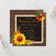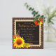 Elegante invitación de cosecha con girasoles, trigo, bellotas, hojas, champiñones, bayas y un pájaro. Puesta en un fondo marrón chocolate con trabajo de pergamino marrón claro.