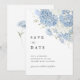 Este diseño de Save the Date en azul polvoriento y blanco presenta suaves flores de hortensias en acuarela con un diseño limpio y elegante.