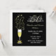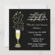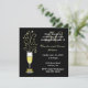 Invitación de fiesta de aniversario de boda personalizada elegante, hecha en negro y dorado. Gráficos de una copa de champán festiva decorada con un lazo de tono dorado en el tallo, y destellos que salen de la parte superior, se sienta en el lado izquierdo de la invitación. Un fondo negro sólido, con texto en tono blanco y dorado es totalmente personalizable para adaptarse a las necesidades de su fiesta. Ideal también para fiestas de cumpleaños.