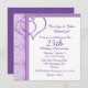 Elegante invitación de aniversario de bodas en púrpura y blanco en forma cuadrada, con un patrón de damasco púrpura y blanco a la izquierda y dos grandes acentos de corazón púrpura. Personaliza el texto púrpura para tu evento especial de aniversario de bodas. Ideal también para fiestas de compromiso, despedidas de soltera y invitaciones de boda.