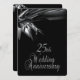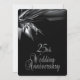 Invitaciones de aniversario de bodas negras únicas para una recepción / fiesta de aniversario de bodas de 25 años. Parte delantera y trasera negra con texto plateado en la parte posterior que da un aspecto elegante a esta invitación de aniversario de cortesía.